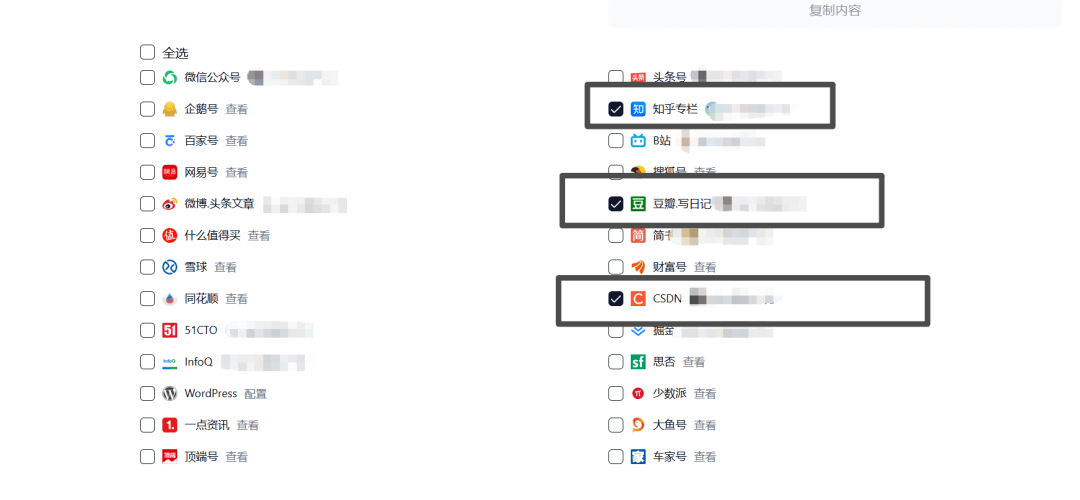 然后下图就是我文章同步的平台,测试了一个多月,很多平台都封号了,最后稳定下来的就只有3个平台,就是下图打勾的这几个。