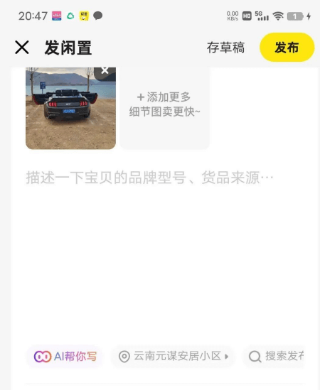 教程本身也不复杂,核心就是:用你的闲鱼账号去发布一条“闲置车辆”类的商品,比如车牌照、二手车图片,发完后系统就会弹出车辆信息填写页,照着填,发出去后大概率会触发开通邀请。