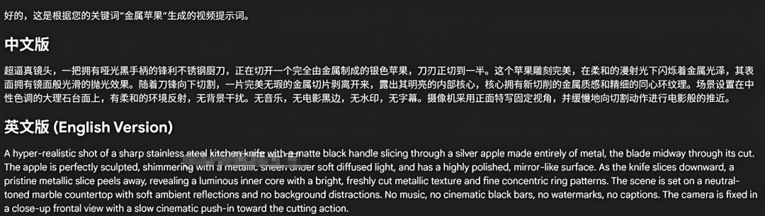 我这边也整理了一份提示词,把它喂给AI,后续你只需要输入关键词,例如“刀切玻璃苹果”,它就会生成中英两个版本的提示词,然后把AI生成的这段提示发给Veo即可。