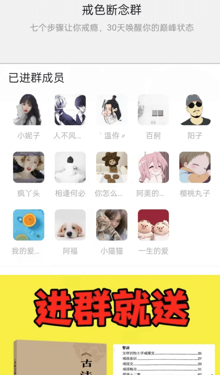 有意思的是,戒色这个东西,有点像信念型消费,有些人真的不是为了资料,而是想“被陪伴”、“有仪式感”、“有人带着坚持下去”,所以你会发现,很多卖资料的其实是在卖一个“群打卡”、“互助陪伴”的氛围感…