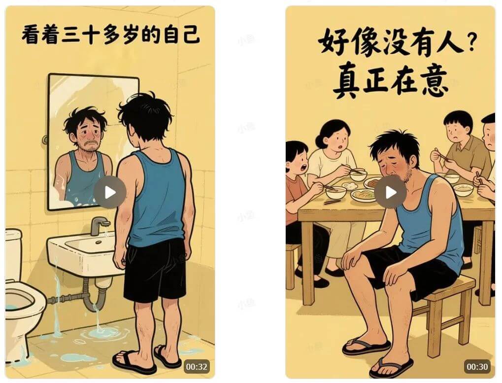 最近这段时间,有一类视频频繁出现在推荐页里,内容不复杂,就是一些关于中年男人的扎心语录,加上一张氛围感十足的插画图,看完感兴趣文末有详细的实操教程。