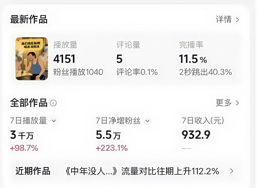 我看过一个对标账号,粉丝6万的时候,一周的收益是932元,虽然不是特别夸张,但也能说明这个赛道是通的。
