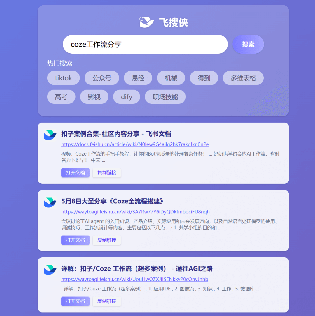 所以,今天我想分享一个更加方便快捷的方法,直接一个网站就搞定,这个网站是专门搜索飞书文档的,如下图: